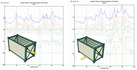 where Guu(jω) is the p × p power spectral density (PSD) matrix of the input, p is the number of inputs, Gvv(jω) is the q × q PSD matrix of the responses, q is the number of responses, H(jω) is the q × p frequency response function (FRF) matrix, and superscript T and ∗ denotes the transpose and complex conjugate, respectively [29,30,31,32]. This equation may be solved after mathematical manipulations that reduce the output PSD to a pole/residue form, and performing Singular Value Decomposition (SVD) of the spectral density matrices [12]. Application of the EFDD method on the recorded accelerations is conducted through ARTeMIS Modal Pro software [33]. The SVD diagrams for two hammer impact tests on the EE case (two exterior cement-board walls) are representatively shown in Figure 11. The natural frequencies and modal damping ratios are extracted and averaged for ambient and free vibration tests of all cases, and are listed in Table 2.