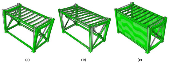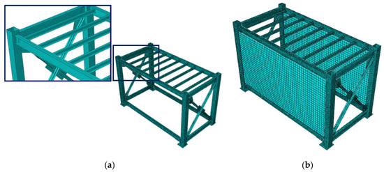 Based on the experimental results, a numerical model for the module can be calibrated. The numerical model is constructed using the finite-element method at a micro level. For the steel module, its different parts are generated with their exact geometry using linear continuum solid elements as the drawing details in Figure 1. Because different parts are welded together, they are tied to each other at their interfaces in the numerical model. The numerical finite element model of the bare module is shown in Figure 12a. The properties of hot-rolled steel sections, i.e., SHS, UB and PFC, are considered with density of 7850 kg/m3, elastic modulus of 210 GPa and Poisson’s ratio of 0.3. The same properties are considered for the steel plates, which are made from Grade 350 structural steel.
