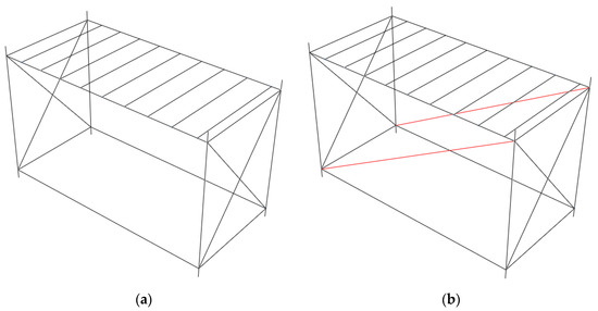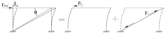 Then two struts are added to the module, one at each long bay to simulate the effects of infill walls, as shown in Figure 15b. Because they are hinged to the module frame, only their cross-sectional area is important parameter in their stiffness. From Figure 16, the following equation is obtained for the lateral loading of the coupled system: