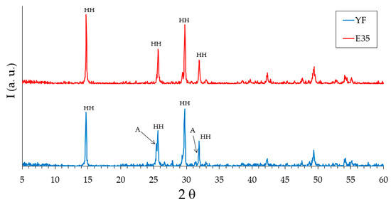 X-ray diffraction analysis for the specimens hardened at the age of seven days (Figure 17) shows diffraction peaks located at angles of 11.6°, 20.7°, 29.1°, 23.4°, and 31.1° corresponding to dihydrate (DH), and did not show peaks corresponding to hemihydrate (HH). The diffractograms are practically coincident between the YF-0.8 and E35-0.7 specimens with the only exception that the diffraction peaks were more intense for the specimen made with plaster material.