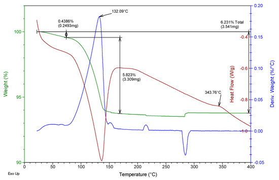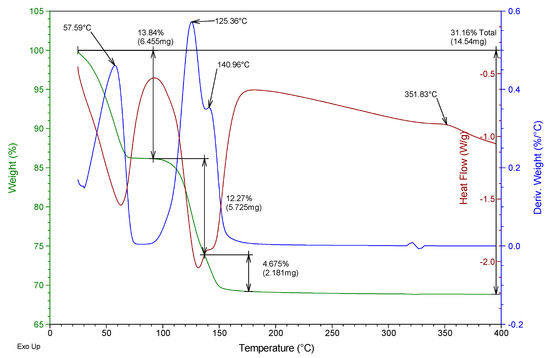 The amount of hemihydrate (HH) present in the raw material samples on both a dry and wet basis is presented in Table 1. For the calculation, the initial mass of the sample subjected to thermal analysis, the loss in mass of the second thermal event between approximately 75 and 175 °C, and the stoichiometry of the reaction Equation (2) have been taken into account.