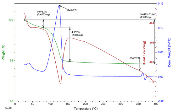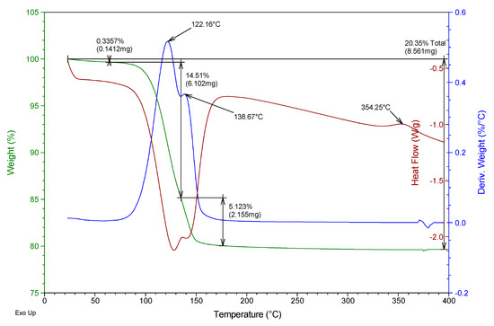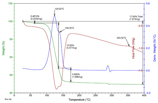 For its part, the hemihydrate undergoes endothermic dehydration to obtain anhydrous calcium sulfate (CaSO4) called soluble anhydrite or anhydrite III at a temperature below 200 °C [31,32]. The phase transformation of soluble anhydrite to insoluble anhydrite (or anhydrite II), exothermic, and that does not entail associated weight loss, occurs at a temperature, around 200 °C, in the case of hemihydrate and between 300–400 °C for the hemihydrate [32]. The exact temperature at which these dehydration reactions occur depends on experimental conditions, and the separation of events that occur at similar temperatures improves when the rate of heating is low and controlled [33].