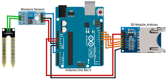 The low-cost Arduino sensor used in this work consists of the following electronic components: Arduino UNO board with ATmega328P microprocessor with 14 digital inputs/outputs and 6 analog inputs, with the possibility of a USB connection to the computer, 8 GB MicroSD memory module to store the information without saturating the internal memory of the Arduino controller, and a humidity sensor, the Arduino Grove-Moisture Sensor HL-69 model (RS component, Madrid, Spain). Figure 4 shows the sensor connection diagram.