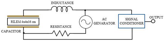where f is the resonance frequency in Hz, C is the capacitor capacity in F, L is the inductance of the sensor in H, Є is the permittivity of the dielectric (in this work of the wet specimen), A is the surface of the condenser plates m2, and d is the distance between the plates of 0.04 m corresponding to the thickness of the standard specimens.