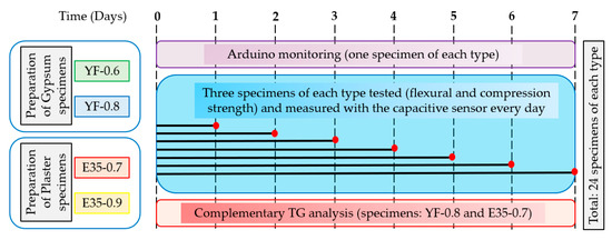 The experimental program carried out in this investigation is presented visually in Figure 7. A total of 24 specimens from the same batch were made for each type of gypsum material and dosage. On the one hand, a test piece of each type was used for monitoring, using the resistive sensor in Arduino, the variation in the mixing water content (100%) until the time of testing according to the UNE-EN 13279-2 standard at 7 days (0%) with a sampling frequency of five minutes. A series of three specimens of each type were tested daily to determine the evolution of the mechanical properties (bending and compression), and the mean value of the three values is presented in this work and their relationship with the moisture content obtained with the help of a capacitive sensor. Finally, complementary tests were also carried out employing gravimetric thermal analysis; these have been carried out on the same specimen at ages of 1, 4, and 7 days in dosages YF-0.8 and E35-0.7 to monitor the composition of the sample and quantify the proportion of dihydrate that is formed at the expense of the hemihydrate as the gypsum sets.