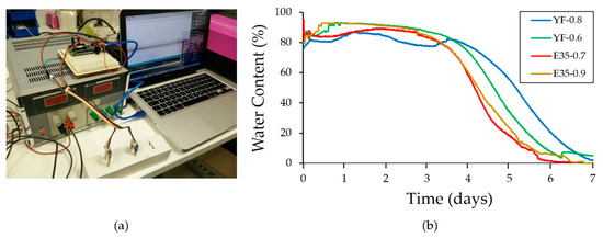 Testing using the Arduino sensor. (a) Measurement equipment monitoring a plaster specimen; (b) results obtained from the variation in the mixing water content against time for each of the tested specimens.