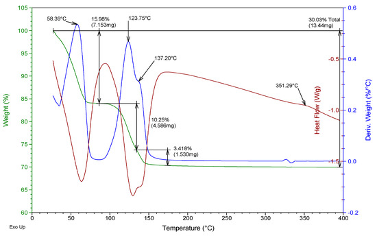 Besides, a thermogravimetric analysis of both raw materials was also carried out using TA Instruments SDT Q600 equipment (Madrid, Spain). Heating was carried out from room temperature to 400 °C at a rate of 5 °C/min and air atmosphere (100 mL/min), analyzing an approximate mass of 40 mg in each test. The results obtained for the two gypsum materials used are shown in Figure 2 and Figure 3. They show the evolution of the mass of the samples versus temperature (green line), the first derivative of the mass versus temperature (blue line), and the energy per unit mass versus temperature (brown line) that monitors associated thermal events. The figures show the percentage of mass (%) lost concerning the initial mass and the mass (mg) lost in each event, as well as the temperature at which the maximum speed in the loss of mass occurs.