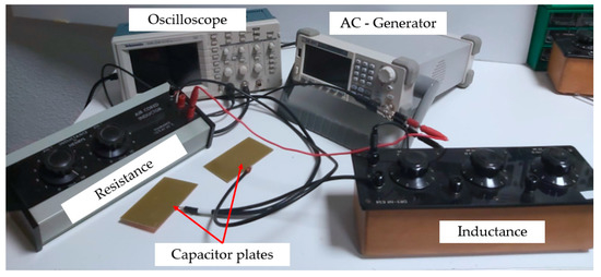 In this way, the implemented sensor consists of a flat-parallel plate capacitor with a surface area of corresponding to the side of the test specimens and which is part of a self-oscillating RLC (resistance–coil–capacitor) circuit. Copper plates that are conventionally used in the elaboration of printed circuits have been used, with a conductive copper face and the outer face insulated with bakelite to avoid measurement errors that could falsify the experiment. The operation of the measuring equipment was based on finding the resonance frequency of the circuit, that is, the one in which the current intensity that circulates was maximum and the pulsation was zero . This resonant frequency was found by viewing the Lissajous figure corresponding to the composition of two signals that are in phase on the oscilloscope. In this way, according to the determination of said resonance frequency measured with the help of an oscilloscope, it is possible to know the variation in the moisture content of the materials tested employing Equation (4):