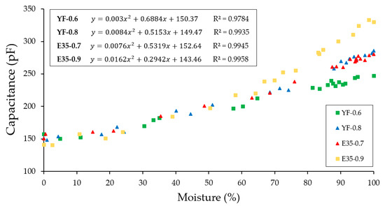 As can be seen in Figure 14, the capacitance values oscillate around 150 and 350 pF for the gypsum materials tested. You can see how there is a strong positive correlation when fitting the values using second-degree polynomial equations. At high humidity values, there are differences between the capacitance values among all the tested samples, observing higher capacitance values for the samples with the highest water/conglomerate ratio of each typology. For humidity values lower than approximately 50%, a single curve was obtained regardless of the material treated. Furthermore, it can be seen that the higher the water/conglomerate ratio, the higher the capacitance values are obtained regardless of the material treated.