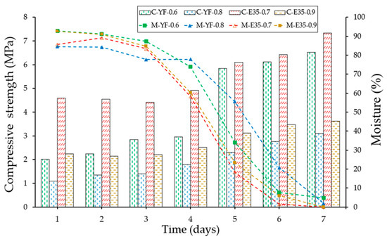 Evolution of the compressive strength (bars) and the moisture content (lines) of the different specimens against time.