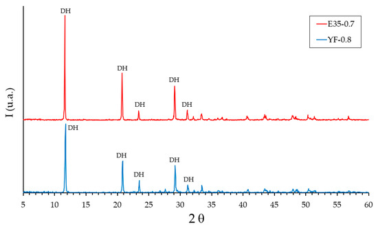 Results of the analysis by X-ray diffraction of the test specimens YF-0.8 and E35-0.7 at the age of 7 days. DH: dihydrate.