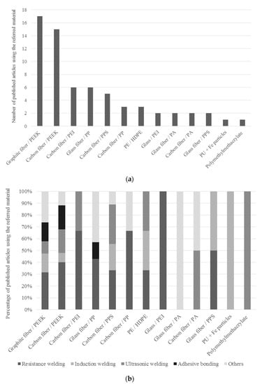 (a)—Main thermoplastic composite materials used in fusion bonding research techniques: Graphite fiber/PEEK [58,59,60,61,62,63,64]; Carbon fiber/PEEK [23,47,60,65,66,67,68,69,70,71,72,73,74,75,76,77] Carbon fiber/PEI [69,78,79,80,81,82]; Glass fiber/PP [34,40,83,84,85,86]; Carbon fiber/PPS [29,32,33,48,87]; Carbon fiber/PP [36,70,88]; PE/HDPE [42,89,90]; Glass/PEI [31,80]; Glass fiber/PA [83,85]; Carbon fiber/PA [36,91]; Glass fiber/PPS [92,93]; PU + Fe particles [94]; Polymethylmethacrylate (PMMA) [95]. Keywords of the search scope: “Fusion bonding”, “Resistance welding”; “induction welding”; “ultrasonic welding”. (b)—Distribution of manufacture techniques to perform bonded and welded joints on the thermoplastic composite materials presented in Figure 2a.