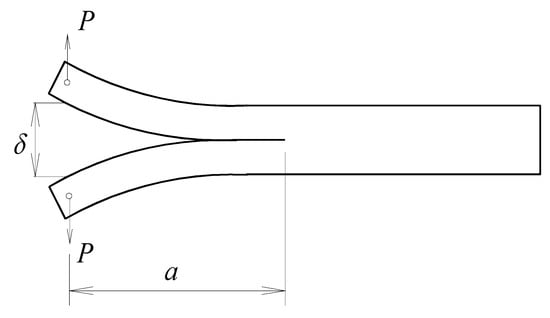 Figure 4. Schematic representation of the double cantilever beam (DCB) test. P is the imposed load, δ is the crack opening displacement, and a is the crack length. - Mode II (Figure 3b): The load creates a sliding shear mode in a direction perpendicular to the leading edge of the crack and the joint will exhibit the highest resistance to fracture. The most suitable method to evaluate this failure mode is the End Notched Flexure specimen (ENF) (Figure 5), which consists in a three-point bending test in a pre-cracked specimen. The resulting load creates an almost pure shear stress state at the crack tip, provided that the specimen is designed so that the adherends deform elastically, which provides shear characterization. The simplicity of this specimen is one of the main reasons to be widely used in mode II fracture characterization [109];