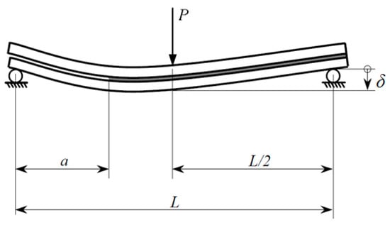 Figure 5. Schematic representation of the End Notched Flexure (ENF) test. P is the imposed load, δ is the specimen’s deflection, L is the length of the specimen, and a is the crack length. - Mode III (Figure 3c): This mode involves a tearing motion or anti-plane shear mode, and does not occur as often as the other two in FRP structural applications, even though it may appear in result of elastic couplings [110,111,112,113].