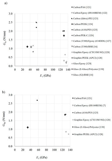 Comparison of critical energy release rates GIc—(a) and GIIc—(b), and elastic modulus E1 of unidirectional thermoset and thermoplastic based composites. Filled and hollow marks stands for thermoplastic and thermoset systems, respectively [7,16,121,122,123,124,125,126,127,128,129,130].