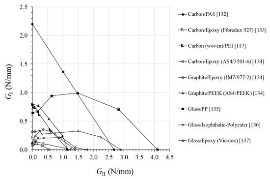 A comparison study between the obtained interlaminar fracture envelopes is shown in Figure 7 for several thermoset and thermoplastic based composites. Different mixed mode ratios are included in order to cover a large range in the GI–GII space. According with the collected data, the thermoplastic based composites presents higher toughness when compared with the thermoset ones, mainly when mode I loading is predominant in the mixed mode ratio. Since the mode I fracture toughness is generally lower than corresponding mode II in most of the thermoset based composite materials, this aspect presents a notable advantage in this context. Therefore, thermoplastic polymers matrices reveals to be promising candidates to replace thermoset based ones in many applications. For example, structural components that are eventually exposed to low velocity impact loading will improve their interlaminar resistance if TPC is employed instead of thermoset based ones. The linear failure criteria can satisfy most of the existing cases displayed in Figure 7. However, some cases reveal an increase of the mode I component with a certain amount of GII, which decreases after to zero when the applied GII equals GIIc. This behavior is known as “overshoot” phenomenon, and has not been observed for mixed-mode fracture for isotropic materials. Only a few of failure criteria can capture this behavior [131].