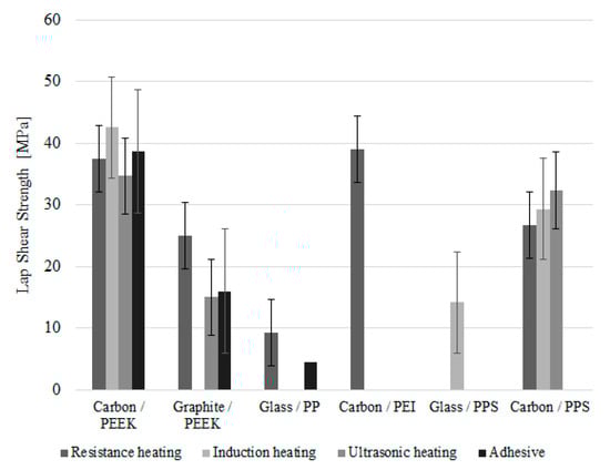 The effectiveness of induction heating in several TPC was evaluated by [33,48,58,60,62,65,74,92,94] with lap shear strength values raging between 14 and 43 MPa (Figure 9).