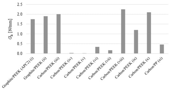 Limited data was found for pure mode I loading fracture tests mainly using carbon/PEEK and graphite/PEEK laminates as shown in Figure 12. This is not an unexpected outcome as these tests are relatively innovative compared to the well-known lap shear tests. In fact, according with Stavrov et al. [41], the DCB test is only used as a supplement test because some works reported it to be unreliable for welded joints as fiber bridging is frequently observed and the crack propagation often occurs within the laminates. As it can be observed, adhesive bonding joints without any other specific surface treatment than abrasion result in very low fracture toughness (low values of GIc), which is associated with adhesive failure due to the low energy surface observed in these polymers. On the other hand, fusion bonding techniques revealed much higher values, even exceeding the critical energy release rate of the material in bulk state when resistance heating is used to perform the weld. Contrary with the previous comparison for lap shear strength results (Figure 9), fracture toughness measured by DCB tests points the resistance welding method as the most reliable fusion bonding technique for PEEK based TPC. This result suggests that lap shear test may not give the full picture of the strength of fusion bonded joints.