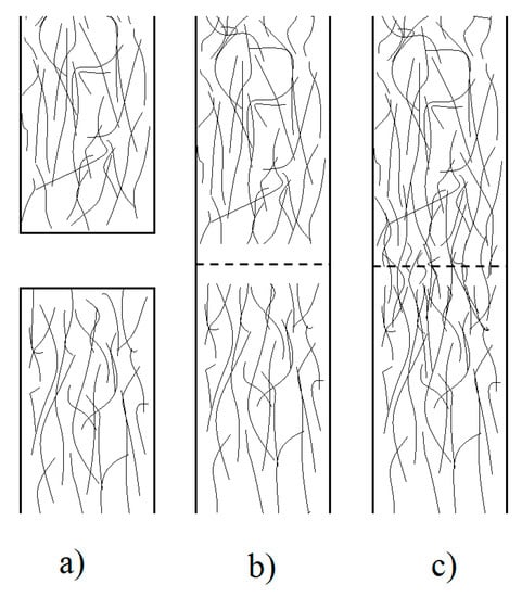 Intimate contact and autohesion stages of the consolidation phenomena: (a) Two distinct interfaces; (b) achievement of intimate contact; (c) collapse of the interface (autohesion).
