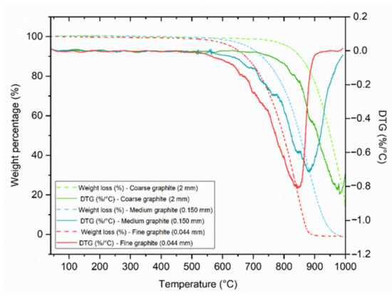 Thermogravimetric analysis (TGA, PerkinElmer, Waltham, MA, USA) was used to characterize the graphite powder materials and understand their decomposition. The TGA experiment was performed in air. The temperature ranged from 40 to 1000 °C, at a steady rate increase of 10 °C/min, and the gas flow rate was kept constant at 30 mL/min.