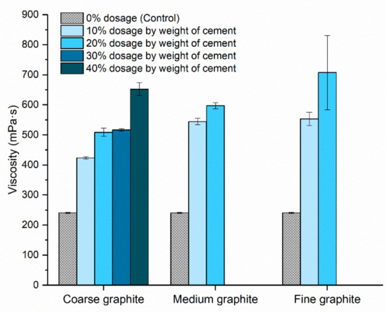 Rheology testing was carried out to assess the effect of graphite fineness on the fluidity of the pastes. A sufficient fluidity is necessary from a practical perspective for the material to be mixed, pumped, and placed without any bleeding or segregation. From Figure 6, the graphite addition resulted in an increase in the viscosity of cement paste in all cases. For the coarse graphite, the viscosity increased progressively by 76% to 171% compared to the control when graphite was added at concentrations of 10–40% by weight. For the medium graphite, viscosity also increased dramatically, and it was not possible to mix after the 20 wt % concentration. Specifically, the viscosity increased by 126% and 148% for the 10 and 20 wt % graphite, which was much higher than the coarse graphite at the same dosages. For the fine graphite at 10 wt %, the viscosity increase was comparable to that of the medium graphite but at 20 wt % dosage, the viscosity was almost three times higher compared to the control. Furthermore, the error bar was large at that concentration, due to difficulties in mixing this high fine graphite concentration. Due to the very high viscosity at the 20 wt % dosage, it was not possible to mix the higher 30 and 40 wt % concentrations with the fine graphite.