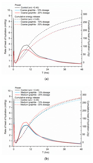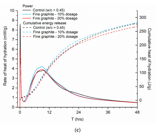 Isothermal calorimetry testing was carried out to assess the effect of graphite on the hydration of cement paste and for comparative reasons; all graphites were tested at 10 and 20 wt %, while the control (CEMI paste, w/c = 0.45) remained constant. The mass to what the heat/power related to in the y-axis (mW/g and J/g) was that of cement only. The reason that cement was chosen as the mass unit was to isolate and identify the specific contribution of the graphite content and particle size on the hydration kinetics. As illustrated in Figure 7, the same hydration peaks were observed in all cases; therefore, the cement hydration was not affected by graphite addition, in agreement to another study that showed that graphite did not directly participate in cement hydration [29]. However, the three graphite products had a somewhat different effect on the hydration. The coarse graphite depressed and widened the main hydration peak (Figure 7a), while the cumulative heat release was lower than the control. It was also observed that the hydration lines for the 10 and 20 wt % coarse graphite overlapped; hence, the increasing coarse graphite dosage did not affect the cement hydration further. These changes in the cumulative heat and progress of hydration may impact and influence the latter development of the hardened properties of the graphite-cement paste. However, the effect on the mechanical performance cannot be solely deducted from isothermal calorimetry testing; therefore, explicit mechanical testing was carried out to confirm this hypothesis and the results are presented in Section 3.4. As the graphite became finer, the effect on hydration was less pronounced. For the 10 wt % medium graphite, the impact on the hydration was insignificant (Figure 7b), and when the dosage increased to 20 wt %, the peak power increased slightly from 3.82 mW/g for the control to 4.35 mW/g. For the fine graphite (Figure 7c), the effect on hydration was even less pronounced, with the hydration curves and the total cumulative heat of hydration remaining almost unaltered, as compared to the control.