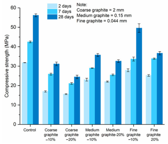 Figure 8 shows the effect of graphite fineness on the compressive strength of cement paste. The three graphite materials were used at 10 and 20 wt % concentrations. At all test ages, the compressive strength reduced with graphite, irrespective of its fineness. Furthermore, the higher the graphite dosage, the lower the compressive strength, with the 20 wt % concentration samples always resulting in a lower compressive strength than the 10 wt % samples. The summary of the % reduction in strength comparing to the control is presented in Table 2. The compressive strength had an inverse relationship with graphite size; the coarse graphite produced the lowest strength, whilst the fine graphite had the least reduction, as compared to the control.
