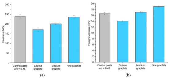 Micro-indentation testing was also carried out to assess the effect of graphite fineness on the mechanical performance of cement paste, by assessing the hardness of the specimens. Graphite–cement paste samples were tested at 56 days, with a 20 wt % graphite concentration, and the error bars show the average of 15 measurements. The compressive strength results would suggest that the hardness would reduce with graphite addition and the effects would be more pronounced for the coarse graphite. Indeed, as seen in Figure 9a, the coarser the graphite, the lower the hardness. The fine graphite almost maintained the hardness of the control specimen, while, on the contrary, the coarse graphite reduced the hardness by 28%. The results can be explained by the graphite softness, which was expected to reduce the hardness of the paste, and also because of packing density, where the finer graphite resulted in a more compact mix, which improved the overall hardness of the sample. The hardness results also provide a further indication of sufficient dispersion of graphite. The error bars were small, and the variance was similar to the control, further supporting the SEM and µCT scan findings. Young’s modulus in Figure 9b reduced for the coarse graphite by 15% but increased for the two finer graphite materials, as compared to the control (14% improvement for fine graphite). The modulus of elasticity is expected to increase with increasing compressive strength [11]; therefore, the finer the graphite, the higher the Young’s modulus (as strength was also higher). The increase in stiffness with the fine graphite could also be explained by changes in porosity, where due to better packing density, the fine graphite-cement paste had a lower porosity, and therefore it was stiffer compared to the control.