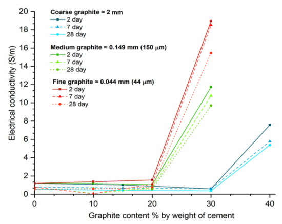 The effect of graphite fineness on the electrical conductivity of cement paste was investigated to establish whether graphite could be used for self-sensing applications. Tests were carried out at 2, 7, and 28 days, and the results in terms of electrical conductivity vs. graphite content are illustrated in Figure 10. Irrespective of graphite fineness and test age, before the sudden increase in electrical conductivity, the conductivities of all samples were less than 2 S/m. Moreover, the electrical conductivity clearly reduced as curing progressed. The two-day samples (solid lines) had higher conductivities than those tested at 7 or 28 days (dashed lines). The reason that the conductivity of the samples reduced over time was due to the free water content available in the mix. Electric current can travel both through the conductive additive (termed as electronic conduction) and through the free water available, which is termed as electrolytic conduction. As the hydration progressed from 2 to 28 days, the free water in the mix reduced; thus, it was more difficult for the electric current to pass the matrix. At the same time, at low graphite dosages, the conductive filler content was not sufficient for electronic conduction to take place and form uninterrupted travel paths. This means that, at low graphite dosages, the specimens were acting as insulators, and, over time, the electrical conductivity would diminish. Furthermore, the percolation threshold was not affected by curing age.