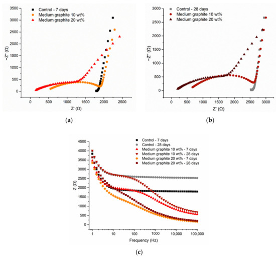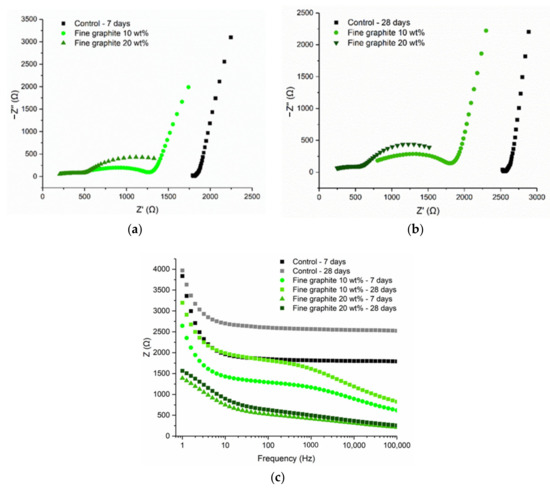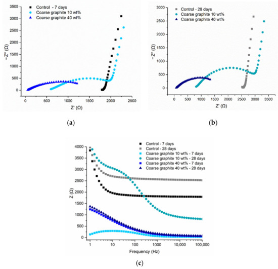 To better understand the effect of graphite fineness on the electrical behavior of the graphite-cement pastes, electrical impedance spectroscopy (EIS) testing was undertaken. The control mix refers to a cement paste with w/c = 0.45, and it is the same in all cases. Coarse graphite was tested at 10 and 40 wt %, with the former being below and the latter above the percolation threshold. The Nyquist plots for 7 and 28 days are shown in Figure 11a,b, whilst the resistance vs. frequency plot is illustrated in Figure 11c. As the hydration progressed, the Nyquist plots shifted to the right, at higher true resistance values on the x-axis, which was expected as electrical resistance increases with curing age. The incomplete electrode arc on the right side of the plot, was very clear for the 10 wt % graphite, meaning that the resistance measurement comprised of both the inherent electrical conductivity of the material and that of the electrode. However, at 40 wt % coarse graphite (above the percolation threshold), the Nyquist plot was obviously different, and the electrode arc was not present. The measured electrical response corresponded only to the bulk response of the material, meaning that a fully conductive path was formed through the cement composites. The arc of the 40 wt % graphite remained almost unchanged as curing progressed from 7 to 28 days and no increase in resistance over time was observed. Therefore, when graphite was added at a concentration below the percolation threshold, the electrical conductivity depended on the water content, and therefore the resistivity increased over time as the hydration progressed. When the percolation threshold was exceeded, the electrolytic conduction mechanism became irrelevant and electric current traveled primarily due to the conductive network that was formed with the graphite particles. In this case, the continuous cement hydration, which reduces the free water, had an insignificant effect on the electrical resistivity.