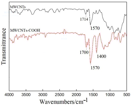 Figure 1 shows the FT-IR spectra of MWCNTs before and after the surface modification. Two new peaks appeared in the PABA-modified MWCNTs curve: the peak at 1700 cm−1 corresponded to carbonyl groups (C=O), and the peak at 1400 cm−1 corresponded to carboxyl groups (–COO) []. The presence of these two peaks indicated that PABA had been grafted successfully onto the surface of the MWCNTs.