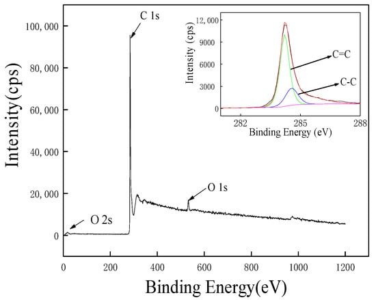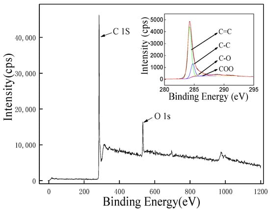 XPS analysis is an efficient method to evaluate the chemical bonds grafted onto CNTs []. Figure 2 and Figure 3 show the XPS spectra of prime and PABA-modified MWCNTs. The inset graph in Figure 2 shows the deconvolution of the C1s spectrum of prime MWCNTs, in which the main peak at 284.6 ± 0.2 eV was assigned to the graphitic C–C bond and the 284.1 ± 0.2 eV was assigned to the C=C bond. In contrast, the C1s spectrum of the modified MWCNTs shown in the inset of Figure 3 demonstrates the existence of an –O–C=O bond (corresponding to the peak at 288.8 ± 0.2 eV) and a C–O bond (corresponding to the peak at 286.5 ± 0.2 eV), which also indicated the successful grafting of PABA onto the surface of MWCNTs.
