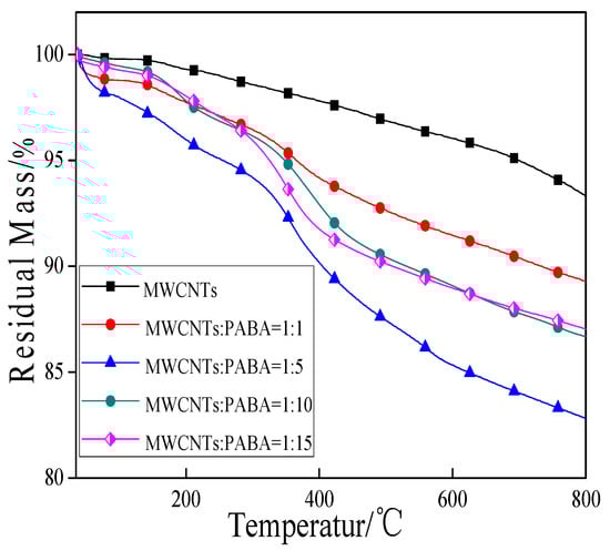 Thermogravimetric analysis (TGA) was performed on a Diamond TG/DTA (Perkin Elmer, Waltham, MA, USA) thermogravimetric analysis analyzer with a temperature range of 20–800 °C. The heating rate was 10 °C /min and the flow rate of nitrogen was 20 mL/min. The difference between the residual mass after degradation of modified carbon nanotubes and that of original carbon nanotubes was regarded as the grafting amount of PABA.