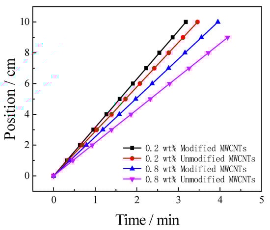 Figure 5 plots the front position as a function of time during the preparation of MWCNTs/epoxy nanocomposites via photoinduced FP. The experimental data in all four sets conformed to well-fitted straight lines on the graph, indicating that the polymerization front propagated at a constant velocity, which is a typical feature of FP []. Table 1 lists the corresponding Vf values calculated according to the line slope. The data suggest a decreasing trend of Vf with the increase in the content of the fillers. One main reason could be the increase in viscosity of the mixture solution (as shown in Table 2). The higher the filler content, the greater the viscosity of the mixture system []. High viscosity hinders thermal diffusion, thus reducing the frontal velocity Vf. The effect of conductive particles should also be considered [,]. When CNTs were added to the polymer, nanoparticles absorbed some amount of the released heat from the material (due to specific heat) and reduced the energy density, since less resin is available per unit volume. However, at the same time, the thermally conductive nanoparticles conducted the heat away from the front preheated the resin and accelerated the front reaction. These two phenomena had opposite effects on the frontal reaction. Since the front velocity of neat resin (0.81 cm/min) is much lower than that with MWCNTs added, it is thought that the addition of a small amount of conductive fillers is favorable in the frontal polymerization reaction. Additionally, the data in Table 1 show that the Vf of the PABA-modified MWCNTs/epoxy resin system was greater than that of the unmodified MWCNTs/epoxy resin system, although the viscosity of the unmodified MWCNTs/epoxy system was lower than that of modified MWCNTs/epoxy system. Except for the enhanced dispersibility and compatibility, the incorporation of carboxyl groups onto the surfaces of MWCNTs may play a crucial role in the frontal polymerization reaction, due to the change in exothermicity during the curing process caused by the reaction between the carboxyl groups and epoxy oligomers.