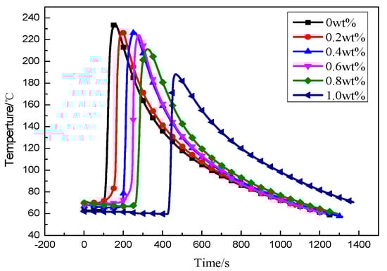 The temporal distribution of temperature of PABA-modified MWCNTs/epoxy reaction system with different modified MWCNTs contents.