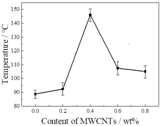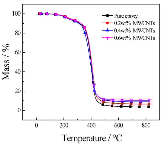 Figure 8 shows the TGA curves of pure epoxy resin and its nanocomposites filled with various amounts of PABA-modified MWCNTs. The weight-loss rate of epoxy nanocomposites decreased as the content of modified MWCNTs increased. The condensate of pure epoxy resin substantially decomposed at ~520 °C, while the residual mass of the epoxy nanocomposites continued to increase when the loading of the modified MWCNTs increased. The residual mass of the three composites was 7.5%, 10.8%, and 12%, respectively, suggesting that the addition of modified MWCNTs enhanced the retention of the epoxy resin. Since MWCNTs resist heat and conduct temperatures well, the modified MWCNTs dispersed in the epoxy matrix absorbed and transferred energy to the external environment quickly once heated, resulting in better heat resistance in the corresponding nanocomposites.