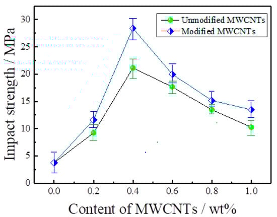 The impact properties of the epoxy nanocomposites with various amount of PABA-modified MWCNTs added were tested (Figure 11). In comparison, the impact properties of the composites with various amounts of unmodified MWCNTs addition are also presented. The impact strength of the composites increased at first, and then decreased along with the increase in the loading of MWCNTs. When the content of the modified MWCNTs was 0.4 wt %, the impact strength jumped to its highest value (28.39 MPa), an increase of 462.23% compared to that of the pure epoxy resin (3.76 MPa), and 34.23% higher than that of the composite with 0.4 wt % unmodified MWCNTs added (21.14 MPa). The results showed that PABA-modified MWCNTs can effectively enhance the impact property of the epoxy composite better than unmodified MWCNTs. However, when the content of MWCNTs exceeded 0.4 wt %, the impact strength value of the composites began to decrease. This could be ascribed to the increase in the viscosity of the mixture, which reduced the dispersibility of the fillers [].
