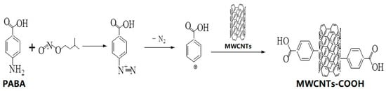 To enhance the compatibility of the MWCNTs with the epoxy matrix, a carboxylation reaction was conducted. Firstly, MWCNTs were dispersed in distilled water at room temperature for 1 h using an ultrasonic disperser. Then, a certain proportion of isopentyl nitrite and various amounts of PABA ((MWCNTs)/(PABA) = 1:1, 1:5, 1:10, 1:15 wt/wt) were added to the flask, which was equipped with a condenser and a drying tube. The mixture was stirred at 80 °C for 18 h. Afterward, the resulting substances were washed with DMF five times and collected by filtration. Carboxylic-functionalized MWCNTs (MWCNTs-COOH) were finally obtained by drying in a vacuum oven at 50 °C for 24 h.
