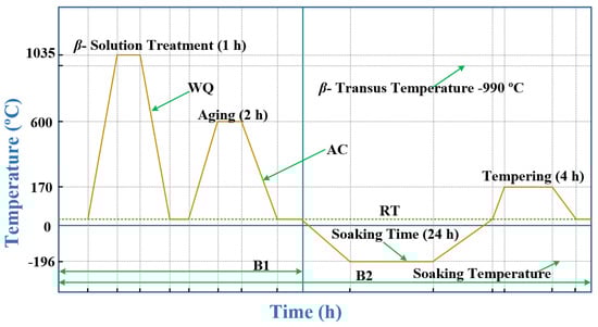 β-transus of Ti-6Al-4V ELI is found to be 990 °C and is determined based on the previous literature data [28,29,30,31,32]. Heat treatment above 990 °C and subsequent rapid cooling generates the martensite microstructure. The heat treatment (HT) as well as CT cycles considered in the present work are elucidated in Figure 1 for better understanding. Codes have been assigned to specimens of Ti-6Al-4V ELI for the purpose of presentation and discussions and the same is given in Table 3.