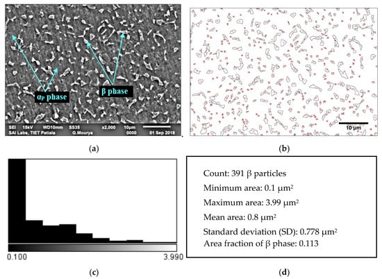The microstructure of MA Ti-6Al-4V ELI alloy is shown in Figure 2a, which is characterized by the presence of β phase (globular particles) in the matrix of primary α (αP). The microstructure of the MA specimen is in agreement with that reported by Gu et al. [37]. Statistical analysis of β phase has been done using ImageJ software. Threshold image of MA Ti-6Al-4V ELI is shown in Figure 2b and β phase distribution is presented in Figure 2c. The details of statistical analysis of β phase observed in MA Ti-6Al-4V ELI is reported in Figure 2d.