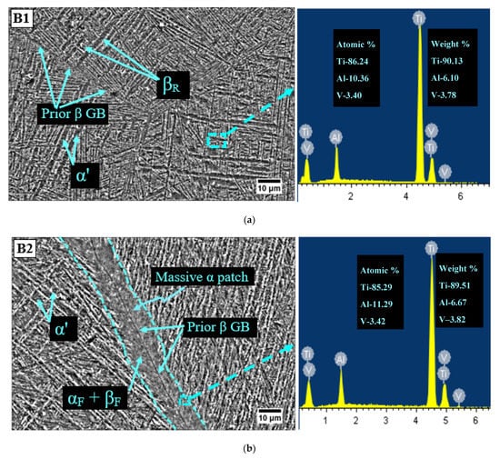 After HT at 1035 °C for a 1 h holding period, microstructures of B1 and B2 specimens were having an unstable β phase. Transformation of β phase to martensite α (α’) occurred due to the suppression of a diffusion-controlled process after quenching in 5% brine solution from 1035 °C. Martensite alpha consisted of α’ having needle like morphology, orthogonally oriented within the prior β grain as shown in Figure 3a. The α’ phase was reported to be rich in vanadium [38] and is further substantiated from the energy dispersive X-ray spectroscopy (EDS) graph of the B1 specimen shown in Figure 3a. The martensite finish temperature for Ti-6Al-4V ELI is below 30 °C (room temperature—RT) [28]. Therefore, untransformed β, designated as retained β (βR) was also there in the B1 sample. The different microstructural elements such as α’, βR and grain boundary of prior β were clearly detected in the SEM image of specimen B1 Figure 3a. The microstructure of the B2 specimen of Ti-6Al-4V ELI is shown in Figure 3b. The cryogenic cycle caused massive α development that was further transformed into ultrafine α(αF) and β(βF) precipitates during the soaking phase at −196 °C. The presence of (αF) and β(βF) precipitates was endorsed from the EDS graph of B2 shown in Figure 3b.
