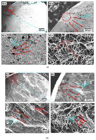 SEM fractography images of Ti-6Al-4V ELI for (a) MA, note: 1—crack initiation point, 2—crack initiation, 3—slow crack propagation, 4—fast crack propagation, 5—fine equiaxed dimples and (b) B2 (β-solution treatment (1035 °C/1 h, WQ) + aging (600 °C/2 h, AC) + DCT (−196 °C/24 h) + tempering (170 °C/4 h, AC)), note: 1—crack initiation point, 2—crack initiation, 3—slow crack propagation, 4—fast crack propagation, 5—facets, 6—striations.
