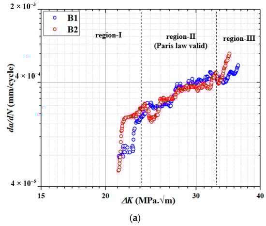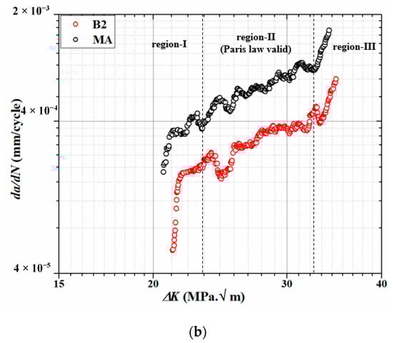 A fatigue crack propagation (FCP) test was performed using the parameters given in Table 4 for each category of specimens of Ti-6Al-4V ELI alloy. The FCP data was continuously measured using the COD clip gauge. The fatigue crack growth rate, i.e., da/dN was plotted against a stress intensity factor, i.e., ΔK for different microstructures. To visualize the effect of CT on the martensite Ti-6Al-4V ELI, da/dN was plotted against ΔK for B1 and B2 specimens as shown in Figure 6a. There are three regions of the plot namely region-I, region-II and region-III. Region-I signifies the crack initiation phase, region-II represents the segment of the plot where Paris law is valid and region-III indicates an unstable fracture. It is clear from the plot shown in Figure 6a that crack initiations in B1 and B2 specimens were almost identical. The FCP rate was quite similar for B1 and B2 specimens in the region-II (Paris validity), which was primarily the most important region in characterizing FCP properties. FCP behavior of B2 specimen was on lower side as compared to B1 sample in region-III. The minor decline in the FCP behavior of the martensite microstructure after exposure to cryogenic temperatures could be attributed to the refinement of the prior β grain. In order to assess the improvement in the FCP properties of B2 specimen versus MA sample, da/dN was plotted against ΔK for MA and B2 samples as shown in Figure 6b. It is distinct from the plot that B2 specimen had displayed significantly improved FCP resistance in all the three regions.