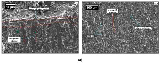 For further insight into the FCP behavior, SEM images (Figure 7) depict the crack propagation path in MA and B2 samples. There are no bifurcations visible in the crack path in MA specimen leading to smooth crack growth once initiated. It is clear from straight line slipping shown in Figure 7a. The results are in complete agreement with earlier research studies [41,44]. The crack path followed by B2 specimen is quite tortuous due to deflections caused by prior β grain boundaries and orthogonal needle like martensite α’. The random orientation of martensite α’ within prior β grain also leads to the generation of secondary cracks reflected in terms of river like slipping as shown in Figure 7b. Bifurcations of macrocracks into secondary microcracks and severe deflections of cracks in β heat treated Ti-6Al-4V has also been reported by earlier research studies [41,43,44]. The net effect of crack deflection is to disperse the strain field energy of the macroscopic crack into multiple secondary microcracks resulting in a significant reduction in fatigue crack growth [44].