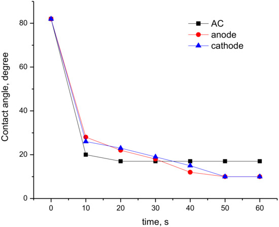 Dependence of contact angle of wettability as a function of treatment time using AC- and DC-discharge. Curves for DC-treated films are adapted by permission from Springer Nature: Springer Nature, High Energy Chem., Piskarev MS, Gilman AB, Gatin AK, Gaidar AI, Kurkin TS, Kuznetsov AA, Copyright (2019).
