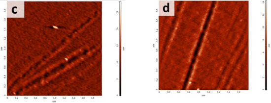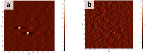 The surface morphology of the native and plasma-treated PET films was evaluated using scanning electron (SEM) and atomic force microscopy (AFM). SEM is carried out using PhenomProX (PhenomWorld, The Netherlands) and the acquired images are given as supporting information (Figure S2). AFM was realized using Solver HV atomic-force microscope (NT-MDT, Russia) with standard HA-NC cantilevers (NT-MDT, Russia). The measurements were carried out in a tapping mode with the acquisition of surface topography and phase contrast. Root-mean-square (Rms) roughness values were calculated from scratch-free scan areas of 2 × 2 µm using the NOVA software version 1.1.0.1851 (NT-MDT, Zelenograd, Russia).