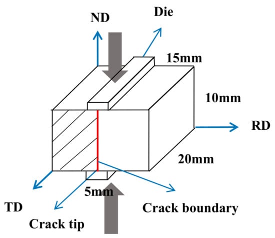Because the stress, strain, and heat flow of the PSC are similar to those of the rolling process [22,23], PSC is employed to quantitatively simulate the high-strain-rate rolling. The parallelepiped samples used for PSC tests, with the initial dimensions of 20 mm in width, 15 mm in length, and 10 mm in thickness, were prepared by the wire-electrode cutting on the casting AZ31 Mg alloy ingot that was made in the Key Laboratory of High Temperature Wear Resistant Materials Preparation Technology of Hunan Province, University of Science and Technology, Xiangtan, China (Table 1 shows the element content of AZ31 Mg alloy). The PSC tests were carried out under vacuum using the Gleeble-3500 thermo-mechanical simulator (Dynamic Systems Inc., New York, NY USA). The Graphite lubricants and tantalum foils were used to eliminate friction between samples and the tools. The samples were heated to the temperature of 300 °C by a thermocouple and then held for 10 min prior to the compression tests. The compression geometry [24] and the Electron Backscatter Diffraction (EBSD, AZtec Nordlys Max data acquisition system, Oxford Instruments, Abingdon, UK) characterization plane is shown in Figure 1. The initial dimensions of the parallelepiped samples are 15 × 20 × 10 mm, and the width of the die is 5 mm. The PSC tests were conducted on the samples until fracture, the fractured samples with small dimensions and crack boundaries were directly processed as the EBSD samples, and no additional cutting was needed. It is worth noting that, the ultimate strain rate of the simulator is 160 s−1, the high-strain-rate rolling usually be carried out at the average strain rate of above 10 s−1, and therefore three different typical strain rates of 10 s−1, 80 s−1, and 160 s−1 were selected for the PSC tests.