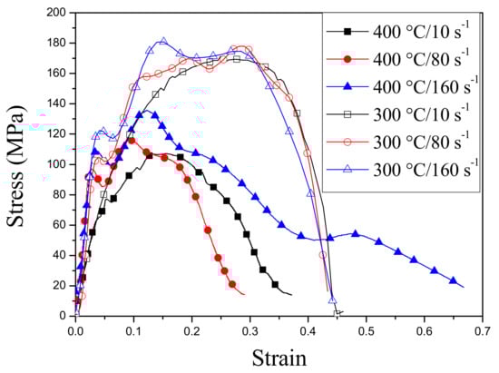 True stress–strain relationships of the PSC samples tested at three different strain rates (10 s−1, 80 s−1, and 160 s−1) and two different temperatures (300 and 400 °C [14]).