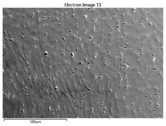 As shown in Figure 4a that, at the 300 °C and 10 s−1, a massive amount of fine grains emerges within the area close to the crack tip, and twinning is also very profuse (the statistical fraction is shown in Table 2). The black regions are actually the grain boundaries with a high density. Because the recrystallized grains are fine and dense within the area close to the crack tip, the numerous grain boundaries set as black lines look like black regions. Within the area far away from the crack tip, a majority of twinning has not evolved into the DRX, and only a tiny minority of ETW and DTW has evolved into the DRX that inherits the c-axis orientation of parent twinning (as shown in Figure 4b, the grain marked by a is a DTW-induced DRX grain, and the grains marked by b are ETW-induced DRX grains). Within the area close to the crack tip, the profuse TDRX has been formed into the necklace-like structure composed by the small grains with smooth grain boundaries (Figure 4c). Only very few grains are evolved from the grain boundary bulging (the grains marked by c and d in Figure 4d). For the whole plane of Figure 4a, the misorientation angle distribution shows that, at the strain rate of 10 s−1, the misorientation angles of grain boundaries are more evenly distributed, and relatively less twinning boundaries are detected, which should be attributed to the reorientation of the TDRX grains. Figure 5 is the second-electronic (SE) image of the region of Figure 4a.