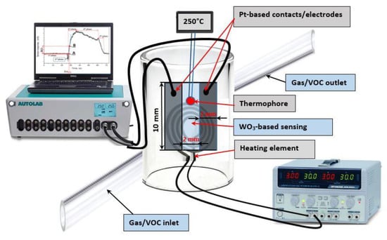 The sensor chip was attached from the back side of the chip (Figure 1). WO3/WO3−x-based gas sensors were tested at several different temperatures (namely at 60, 120, 180, 210, 250, and 270 °C), in the presence of the same concentrations of VOCs (methanol, ethanol, isopropanol, acetone) and ammonia gas. Gas flow rate measured in standard cubic centimetres per minute (SCCM) was 100 cm3/min.